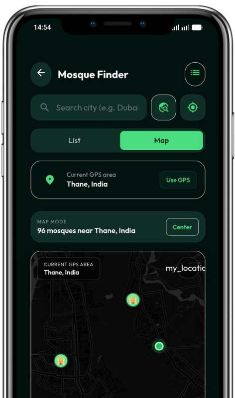 Discover nearby masjids instantly whether you’re at home or traveling.