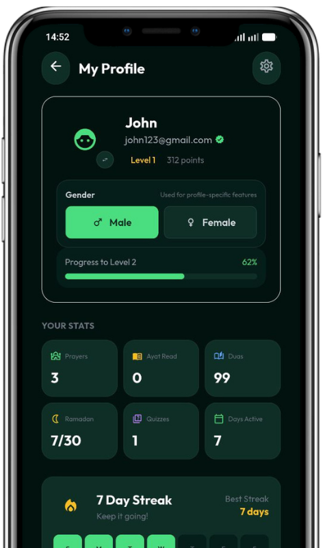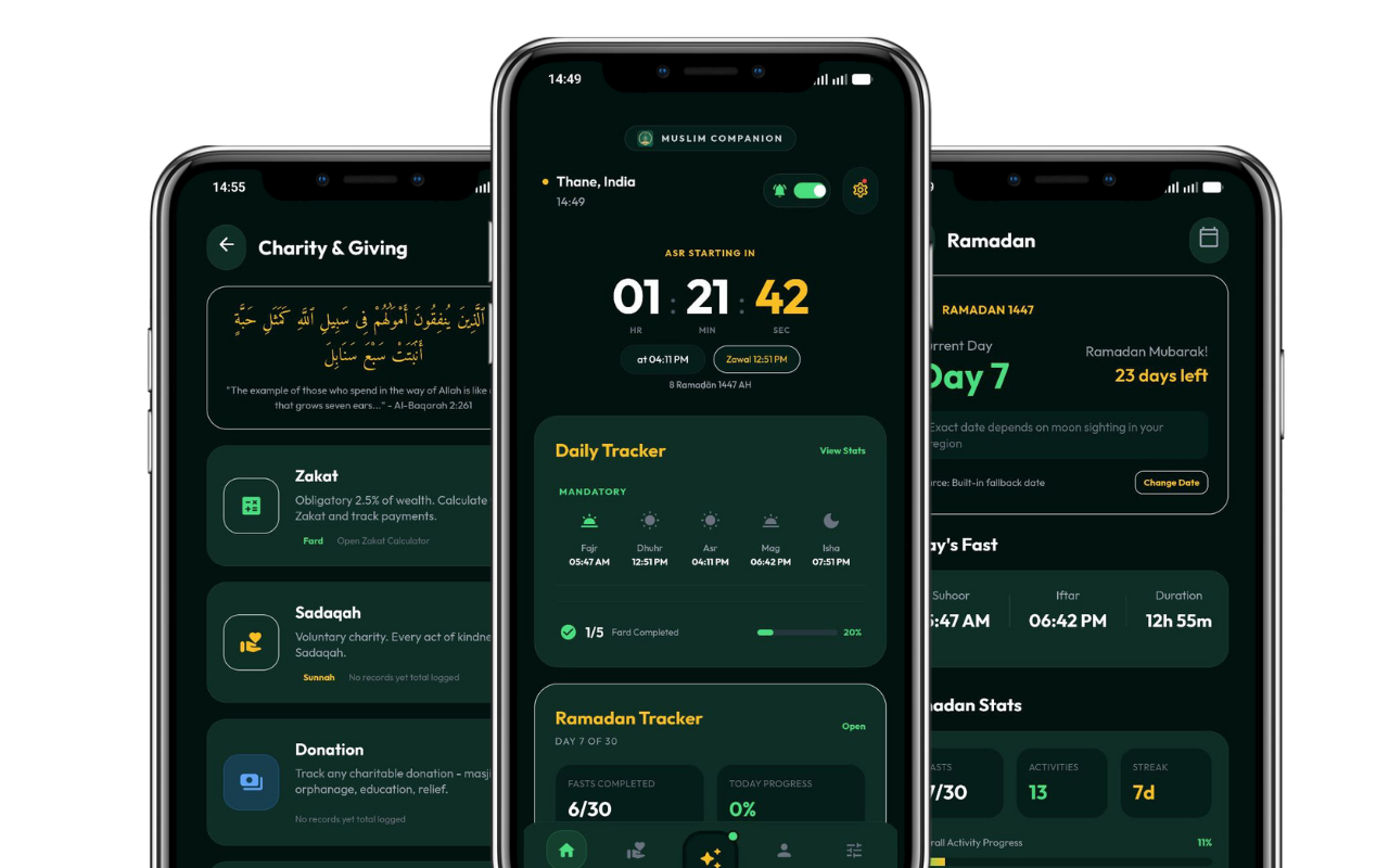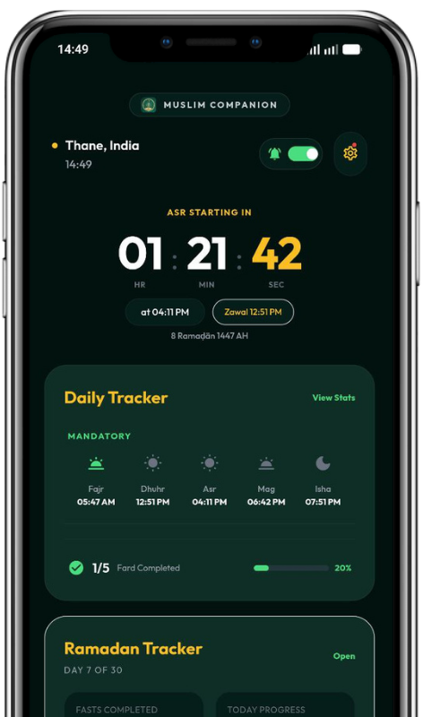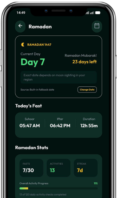 A dedicated Ramadan section to help you stay consistent throughout the month with fasting times, Taraweeh tracking, and daily progress insights.