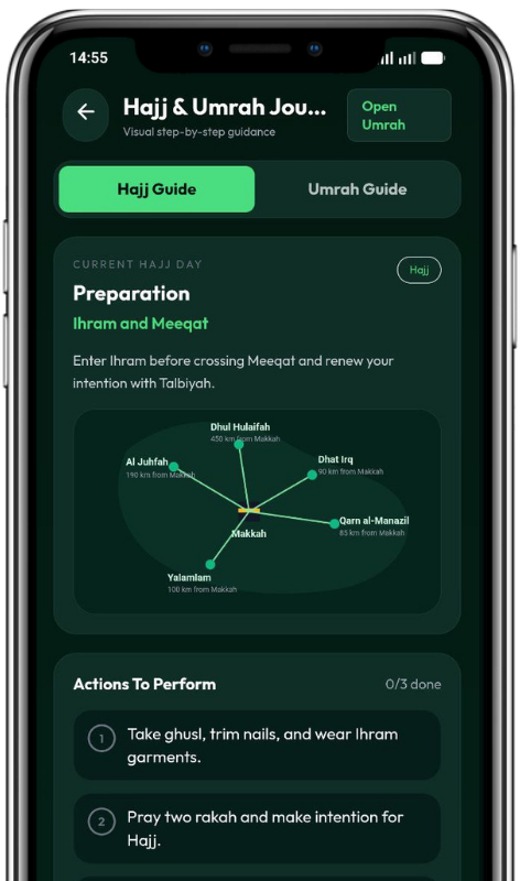 Step by step visual guidance to help you complete every pillar of Hajj and Umrah correctly from Ihram to Tawaf.