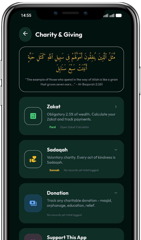 A built in charity hub to help you calculate Zakat accurately, log Sadaqah, and track donations all in one place.