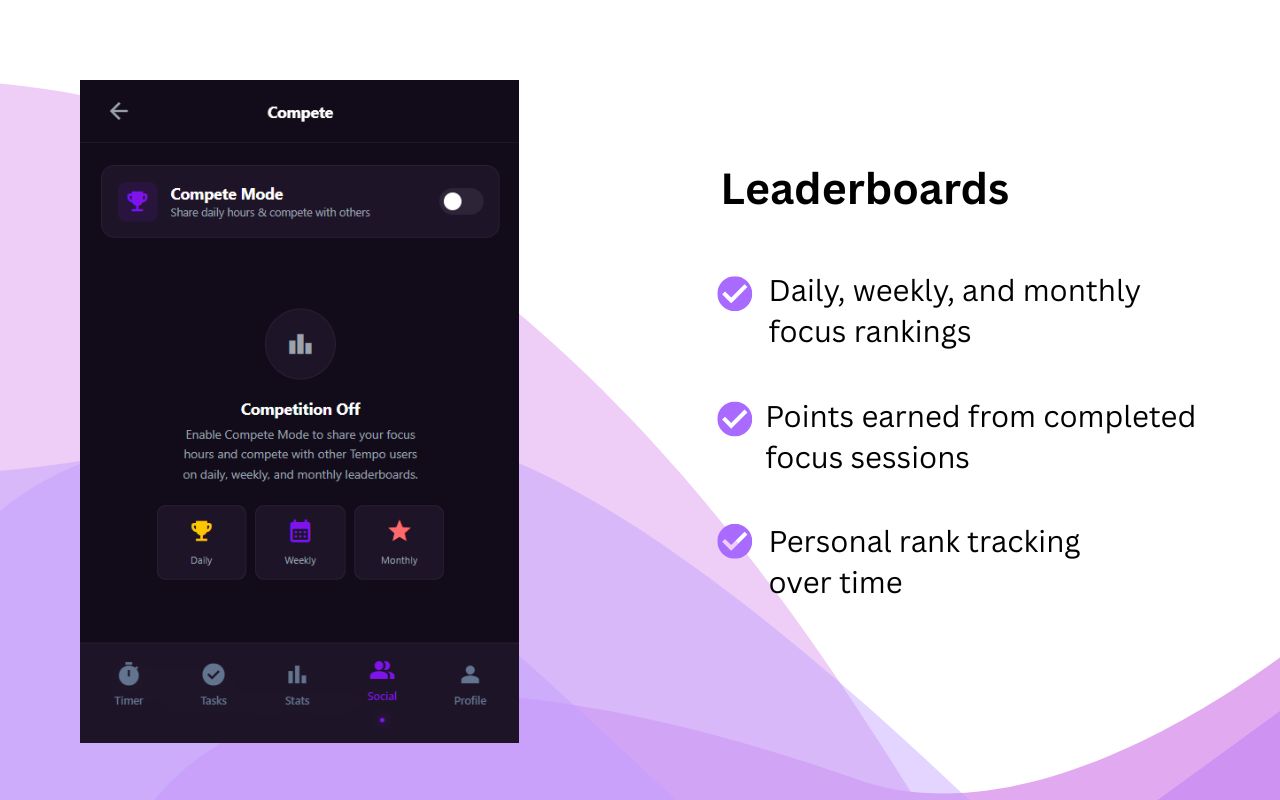 Compare focus activity with others using Tempo through daily, weekly, and monthly rankings, creating accountability and motivation through shared progress.