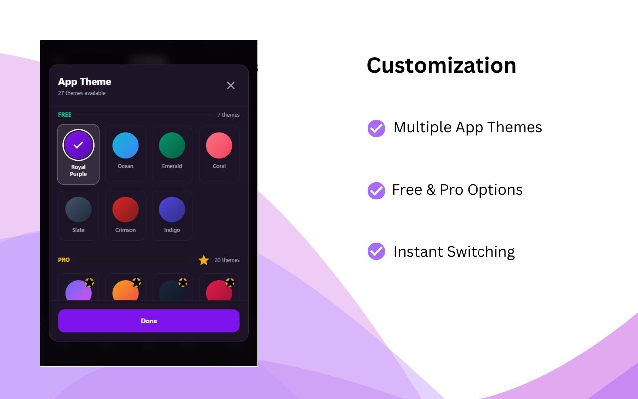 Customize the app’s appearance using built-in themes, with free and premium options available.