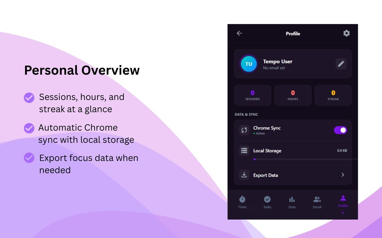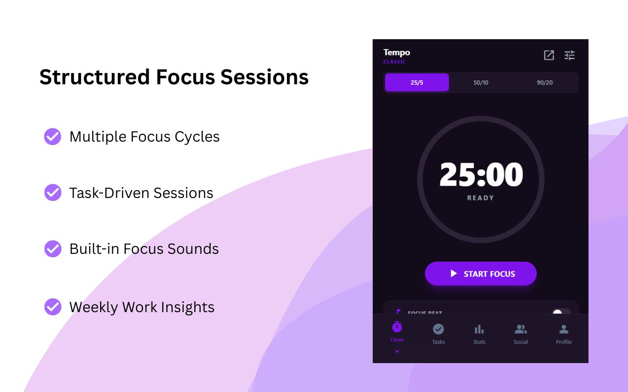 Tempo is a beautifully designed deep-work Chrome extension that helps you focus longer, work smarter, and track real progress without overwhelming you.