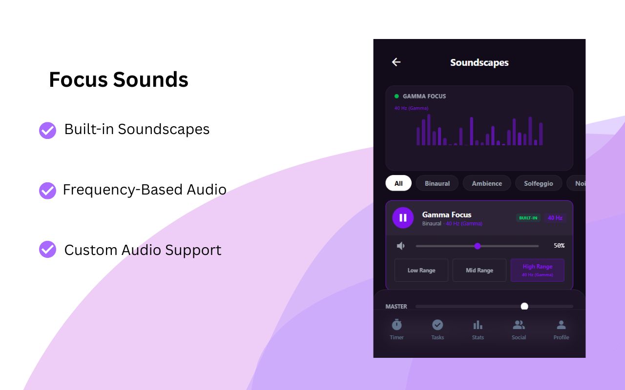 Tempo offers a curated library of binaural beats, solfeggio tones, ambient sounds, and noise-based tracks, with the option to play custom audio when needed.