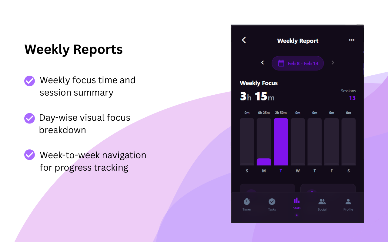 Automatically record focus sessions and view clear daily and weekly summaries, without background monitoring or intrusive tracking.